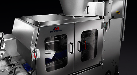 Le format des pâtons préfaçonnés et légèrement farinés à la sortie de la chambre volumétrique est compatible pour alimenter le bloc de façonnage MECATHERM.